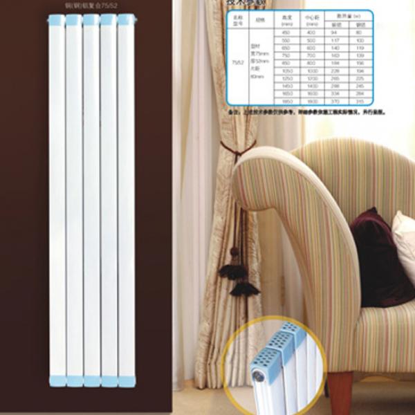 铜铝复合系列暖气片,散热器,是由铜管和铝材组合加工而成的对流型暖气片。其外观美观大方。散热器与水接触的部分即水通道全部为铜管,通过铝材与铜管紧密结合,具有高效和稳定的导热性能。铝材的作用是扩大暖气片散热面积,提高散热效果。由于暖气片内的水道均由铜管构成,所以其抗氧化腐蚀能力强,几乎适合用于所有的采暖系统。