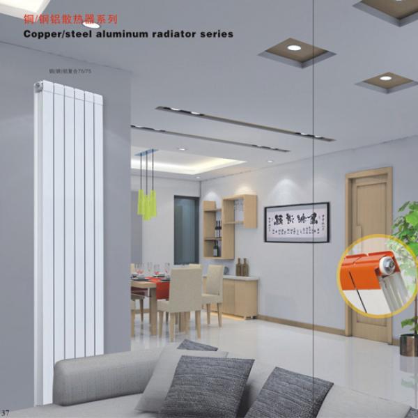 铜铝复合系列暖气片,散热器,是由铜管和铝材组合加工而成的对流型暖气片。其外观美观大方。散热器与水接触的部分即水通道全部为铜管,通过铝材与铜管紧密结合,具有高效和稳定的导热性能。铝材的作用是扩大暖气片散热面积,提高散热效果。由于暖气片内的水道均由铜管构成,所以其抗氧化腐蚀能力强,几乎适合用于所有的采暖系统。